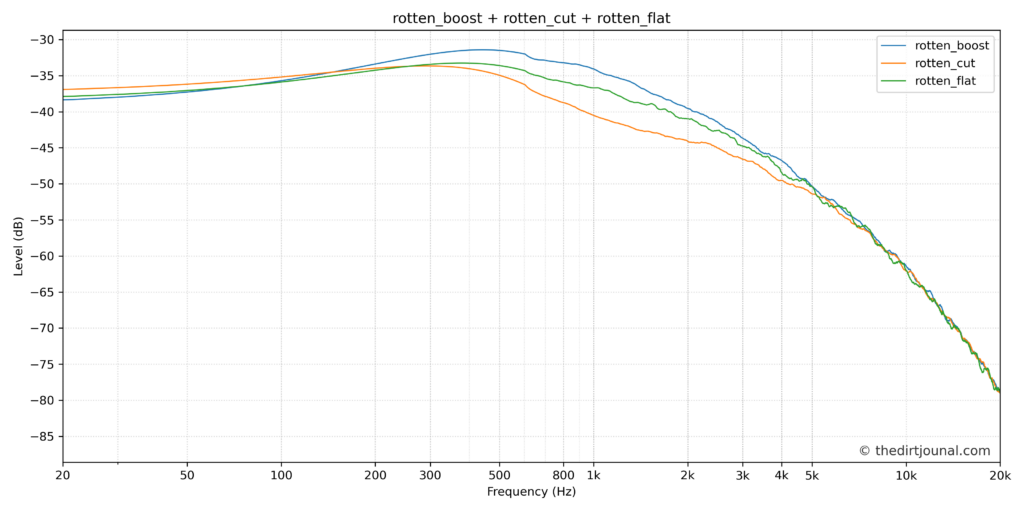 Starting already at 200Hz the boost peaks around 500 and the three lines join each other around 5k.
